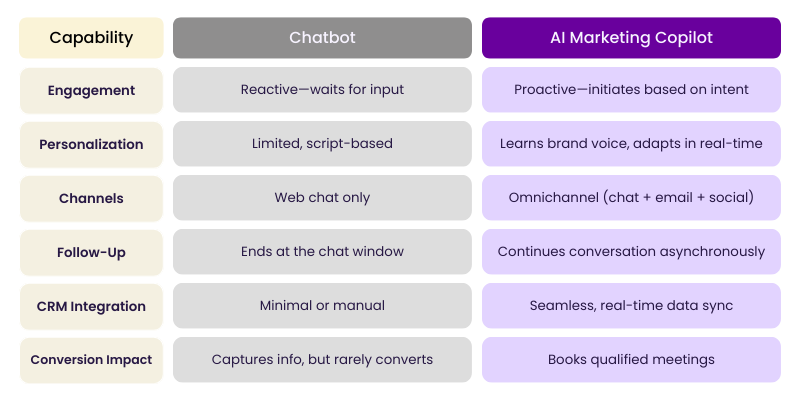 Here’s how traditional chatbots and AI Marketing Copilots compare across key dimensions: