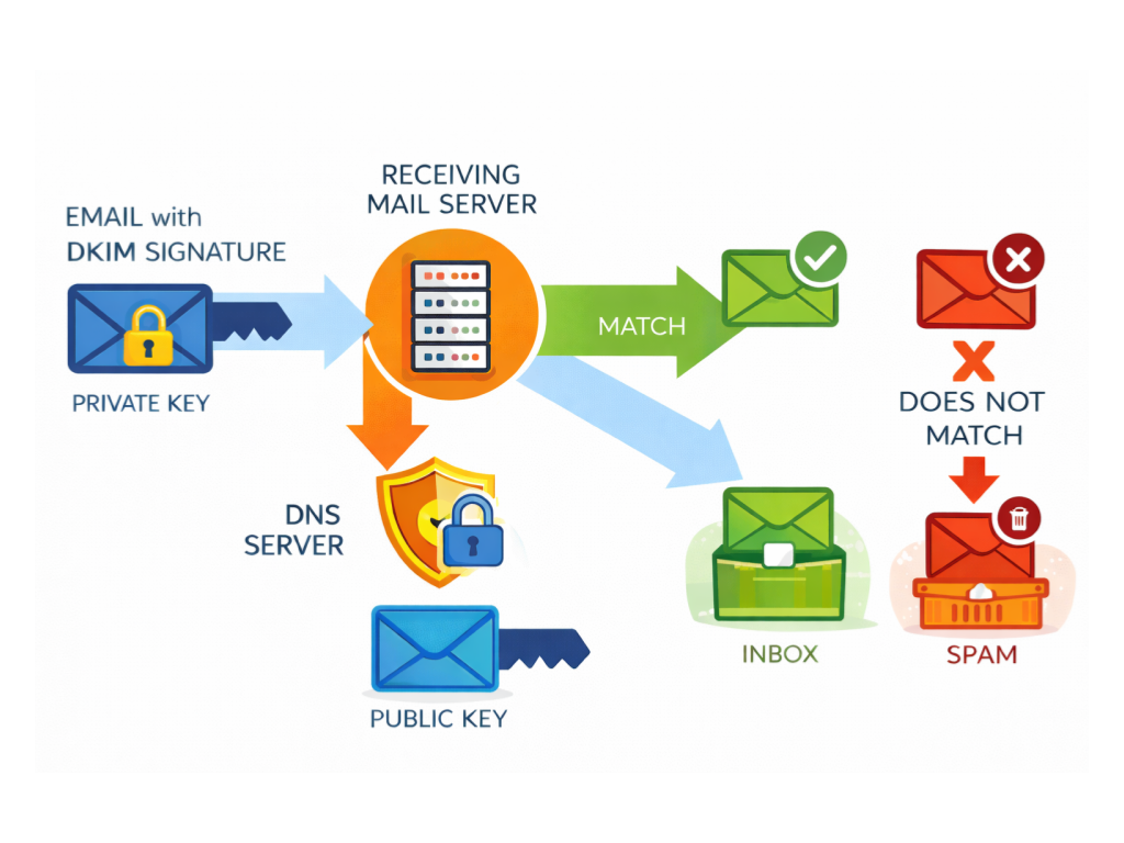 DKIM adds a digital signature to outgoing messages. Your sending system signs each message with a private key. Receiving mail servers look up your public key in DNS and use it to verify the signature. A valid signature signals that the message content stayed intact after it left your sender.