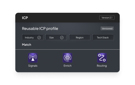 Build flexible profiles using filters like industry, size, tech stack, or tier. Version and reuse them across your funnel, establishing consistent, automated qualification criteria.